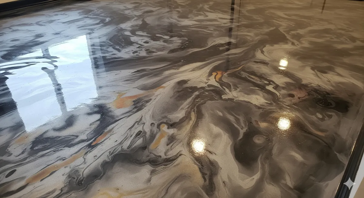 Metallic epoxy is where things get interesting visually. These floors have that swirled, almost three-dimensional look—kind of like marble or flowing water depending on how we apply it. It's become really popular in Tampa for upscale garages, man caves, and showroom spaces.