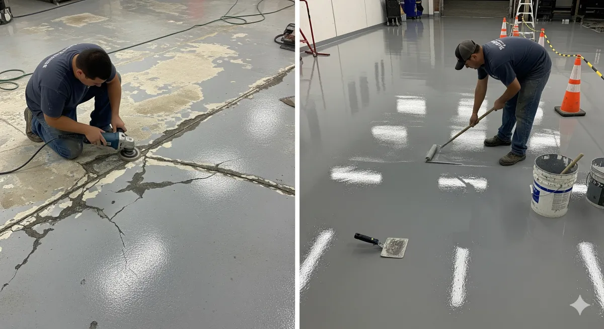 If the epoxy is peeling, that usually means poor prep work originally—the coating never bonded right to the concrete. We grind off the failing sections, prep properly this time, and recoat those areas to match. If it's just worn thin from heavy use, we can add another topcoat layer to protect it again. Cracks in the underlying concrete need to be filled and sealed before any new coating goes down.